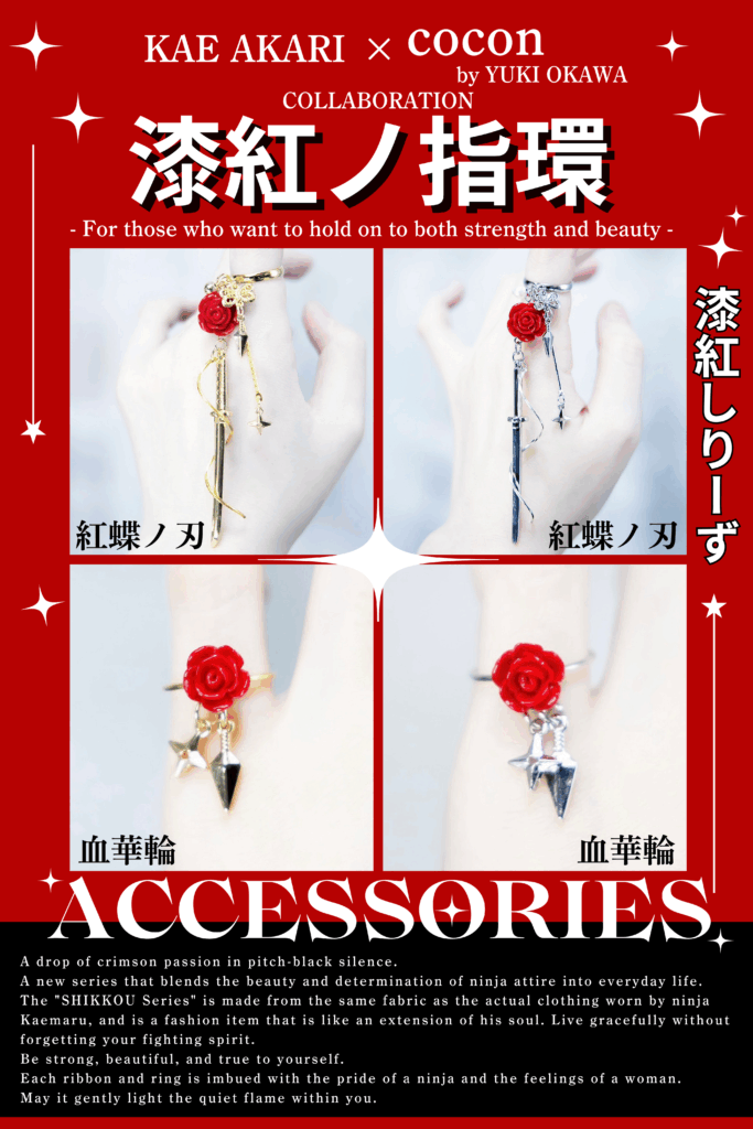 「漆紅しりーず」は、忍者 : 紅月かえ丸 が実際に纏う衣と同じ布から生まれた、魂の分身のようなファッションアイテム。